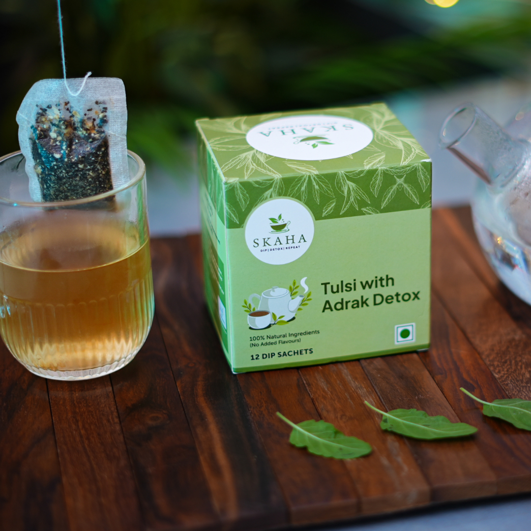 Experience the age-old healing power of Tulsi (Holy Basil) and Adrak (Ginger) in a modern, easy-to-use dip sachet. Crafted with 100% natural ingredients and no added flavours, Skaha Natural Detox Dips help you detox your body the Ayurvedic way — just Dip • Sip • Repeat.